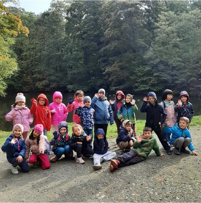 Dnes jsme si udělali sportovní den se zajímavou procházkou do lesa. Nejprve jsme sportovali v tělocvičně, kde jsme si vyzkoušeli na jednotlivých stanovištích různé disciplíny -  přeskoky přes lavičku, koulení , házení do koše, překážkovou dráhu i cvičení s obručemi, zahráli jsme si i pár našich oblíbených her. Pak jsme se vydatně nasvačili a šli ven do nedalekého lesa. Tam nás čekalo překvapení. V tom lese totiž žije malý drak, který je takový vtipálek a rád lidi (a hlavně děti) zkouší z různých aktivit. Poslal nám pár úkolů, které jsme si zkusili splnit a protože jsme šikovní, čekala na nás od draka i malá odměna - tu jsme si ale museli najít. Nakonec jsme se stačili pobavit i na hřišti a pak už honem do školy na oběd. Měli jsme velký hlad.