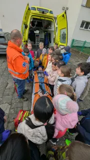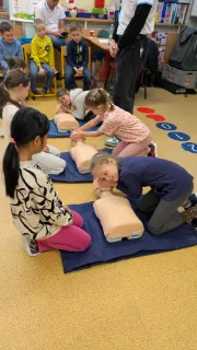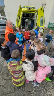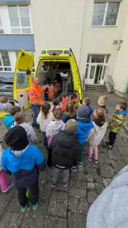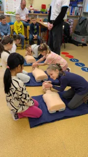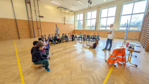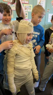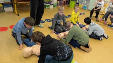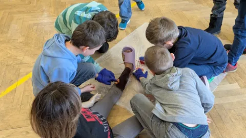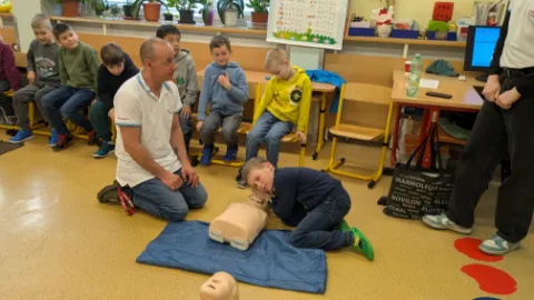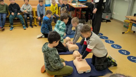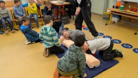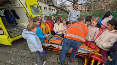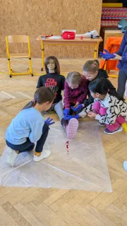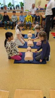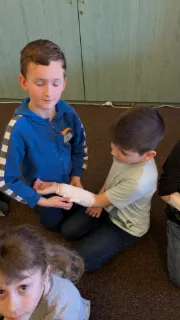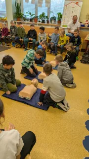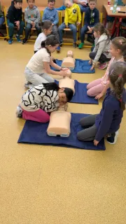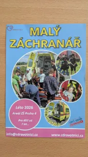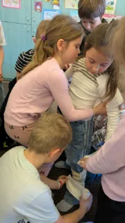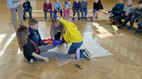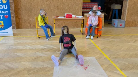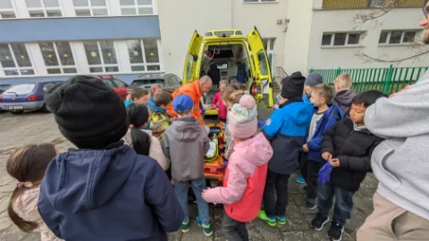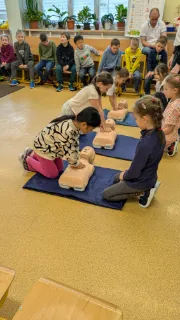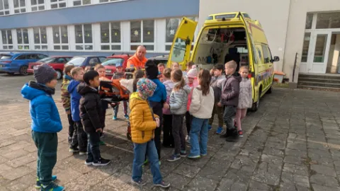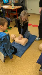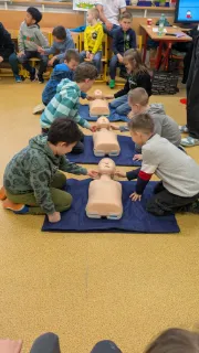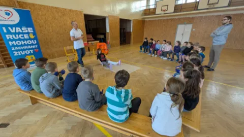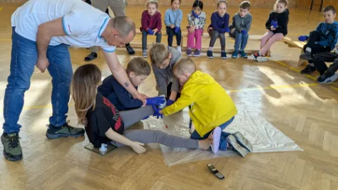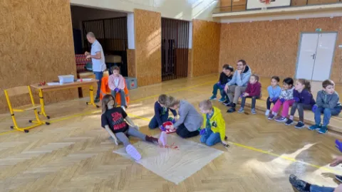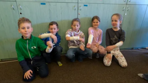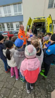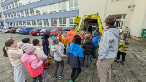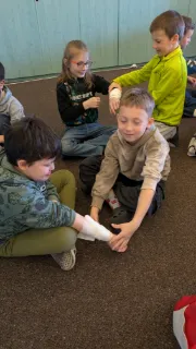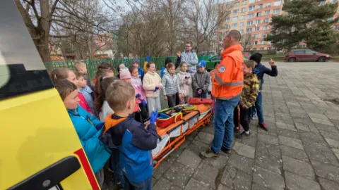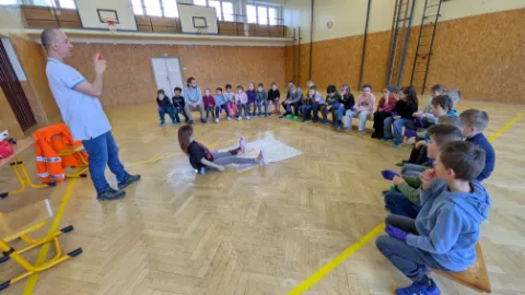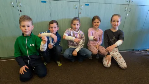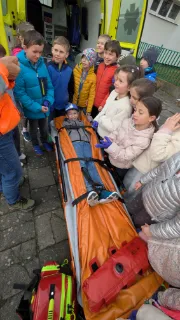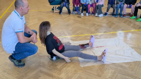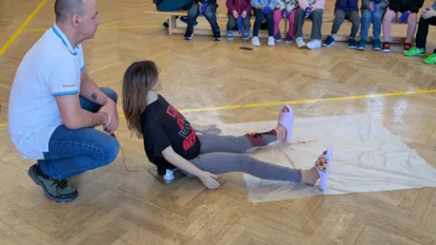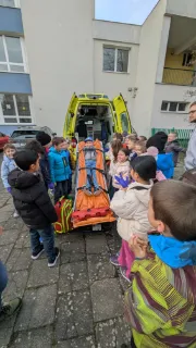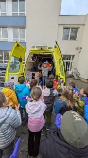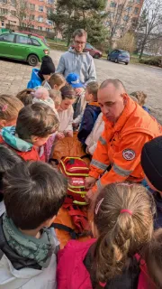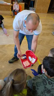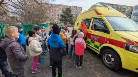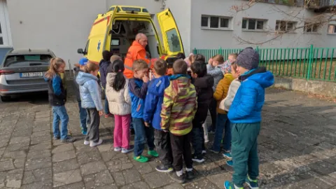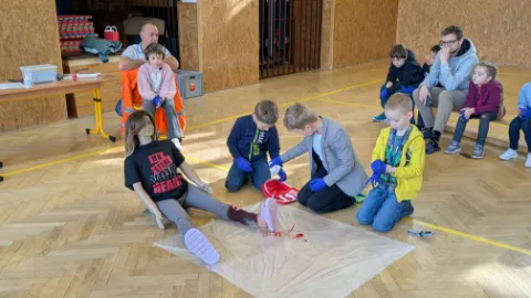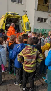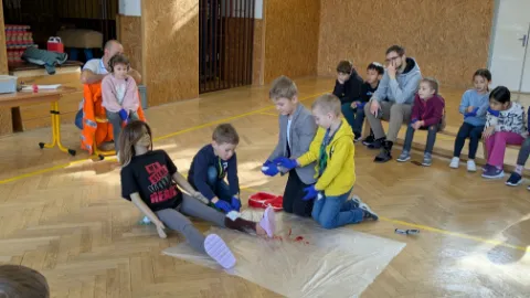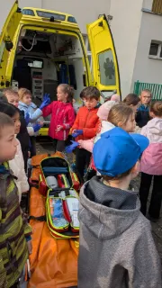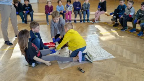 Zdravotníci nás seznámili se základy první pomoci. Některé věci jsme si mohli i vyzkoušet. Prohlédli jsme si vybavení sanitky a Šímu jsme ošetřili a naložili do sanitky jako pacienta. Poslední část se zdravotníky na nás čekala v tělocvičně - ha, otevřená zlomenina. Už víme, jak zavolat na telefonní číslo 155 a jak ošetřit zlomeninu. Všichni jsme si ještě ve třídě vyzkoušeli obvazování a nakonec jsme z Dominiky udělali mumii. To bylo obvazů. Se zdravotníky můžeme jet i na tábor.