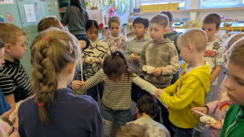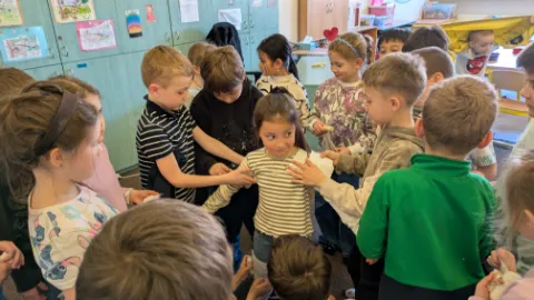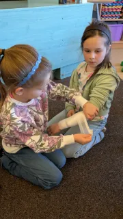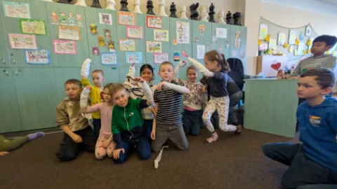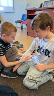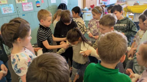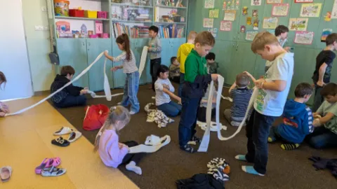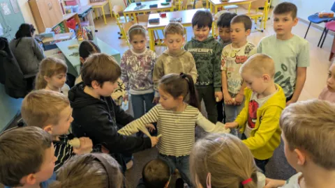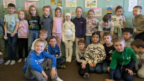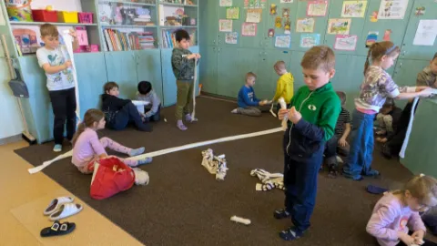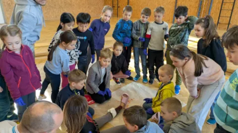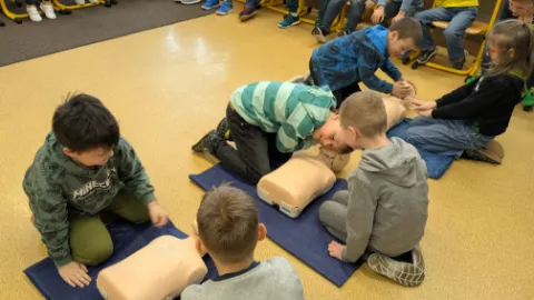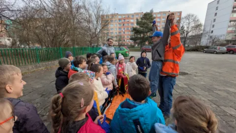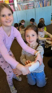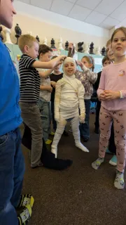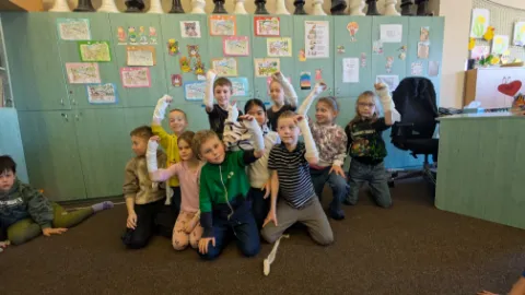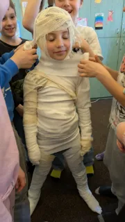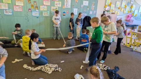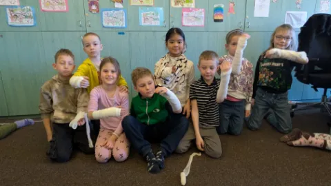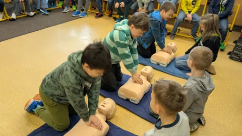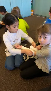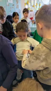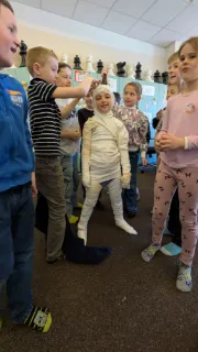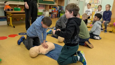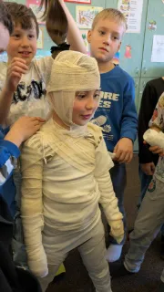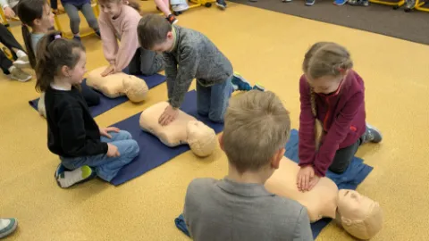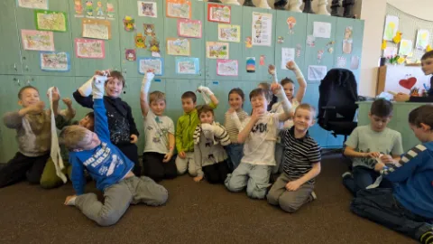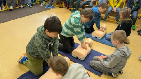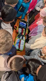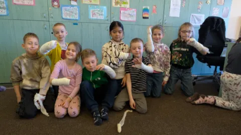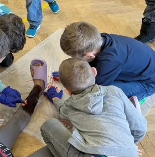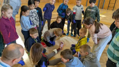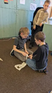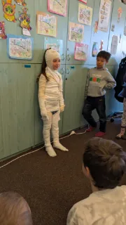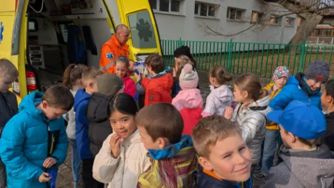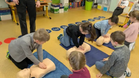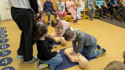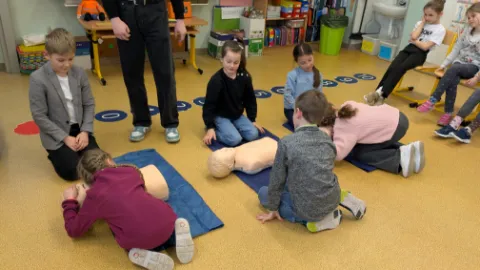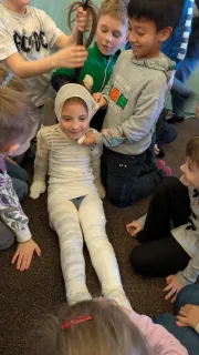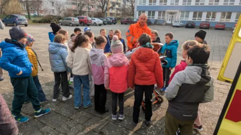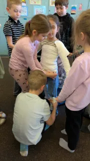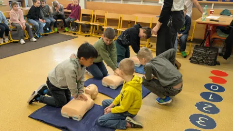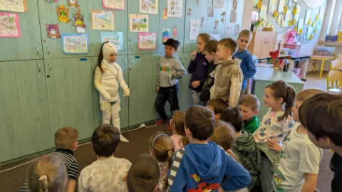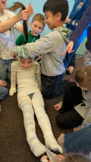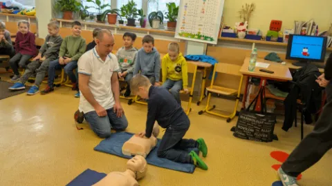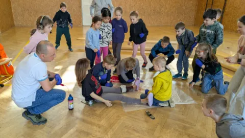 Zdravotníci nás seznámili se základy první pomoci. Některé věci jsme si mohli i vyzkoušet. Prohlédli jsme si vybavení sanitky a Šímu jsme ošetřili a naložili do sanitky jako pacienta. Poslední část se zdravotníky na nás čekala v tělocvičně - ha, otevřená zlomenina. Už víme, jak zavolat na telefonní číslo 155 a jak ošetřit zlomeninu. Všichni jsme si ještě ve třídě vyzkoušeli obvazování a nakonec jsme z Dominiky udělali mumii. To bylo obvazů. Se zdravotníky můžeme jet i na tábor.