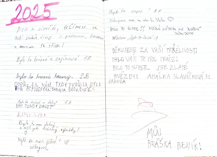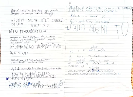 Letošní adventní dílničky v Ovocné zahrádce se nesly v opravdu výjimečném duchu. Celé odpoledne bylo naplněno radostí, smíchem a tvořivým zápalem dětí i dospělých. Vůně jehličí a svíček provázela společné chvíle, během nichž vznikaly nádherné vánoční dekorace, originální ozdoby a dárky od srdce. Rodiče i děti měli možnost své dojmy zapsat do připravených sešitů – a jejich slova nás dojala. Psali o tom, jak moc si společný čas užili, jak rádi tvořili a jak se u nás cítili příjemně a vítaně. Děkujeme za všechny krásné věty, obrázky i dětské podpisy, které jsou pro nás tou nejhezčí odměnou. Adventní dílničky nám připomněly, že Vánoce nejsou jen o světýlkách a dárcích, ale především o společných zážitcích, kreativitě a přátelské atmosféře. Jsme moc rádi, že jste byli u toho s námi a těšíme se na další setkání plná dobré nálady a inspirace. Vaše paní vychovatelky z Ovocné zahrádky.